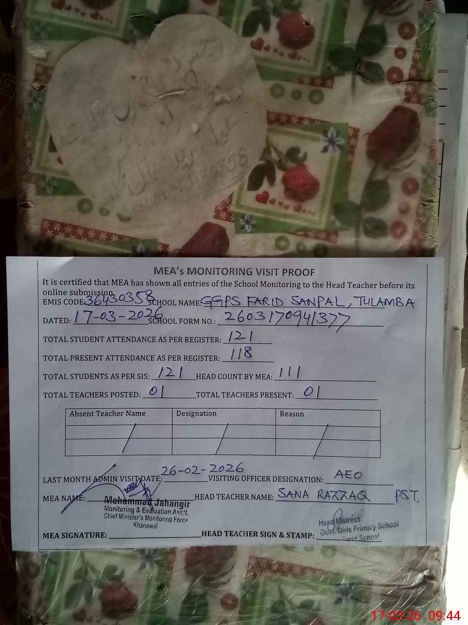 | EMIS Code: 36430358 | Name of School: GGPS FARID SANPAL, TULAMBA | |||