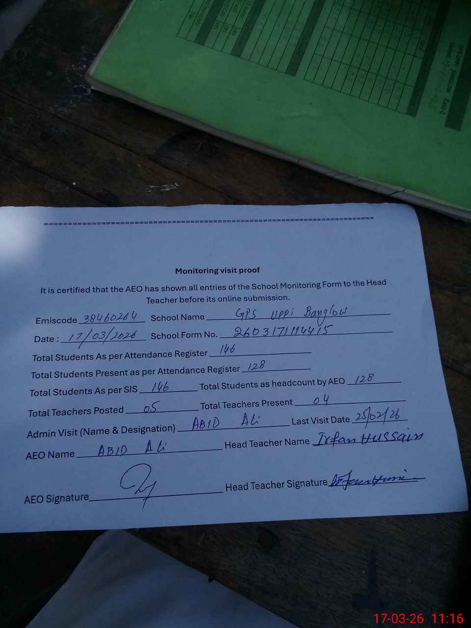 | Attendance Register | Head Teacher | MEA with School | Visit Proof |