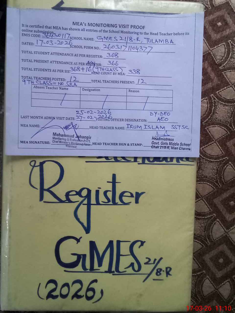 | Attendance Register | Head Teacher | MEA with School | Visit Proof |