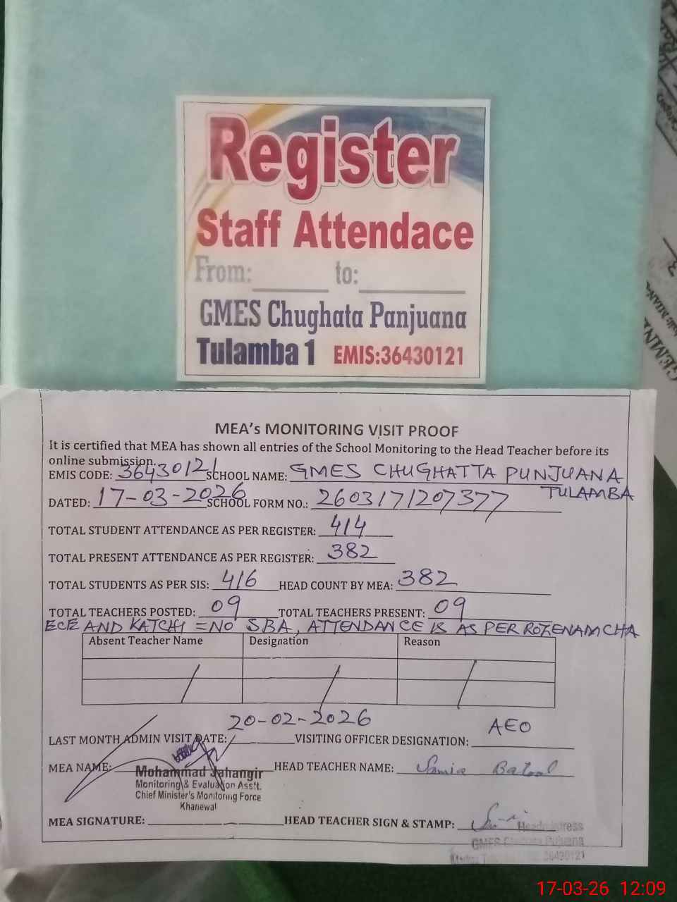 | EMIS Code: 36430121 | Name of School: GMES CHUGHATA PUNJUANA, TULAMBA | |||