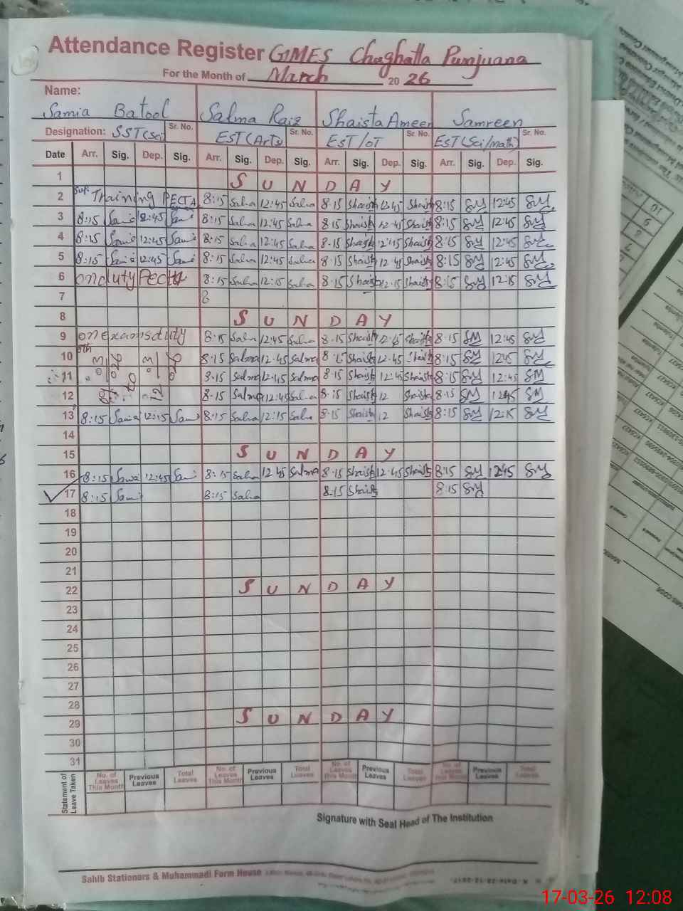 | Remarks (Use Separate Page if Required): ECE AND KATCHI CLASSES NO SBA STUDENTS ATTENDANCE IS AS PER ROZENAMCHA NSB GRANTS AND FTF RECORDS ARE NOT MAINTAINED THESE RECORDS ARE MAINTAINED WITH LEAD PENCIL WITH OUT RASEED NOS | |||||