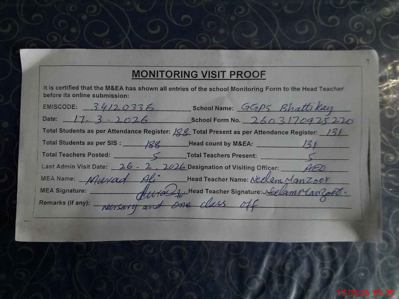 | EMIS Code: 34120336 | Name of School: GGPS BHATTI KAY | |||