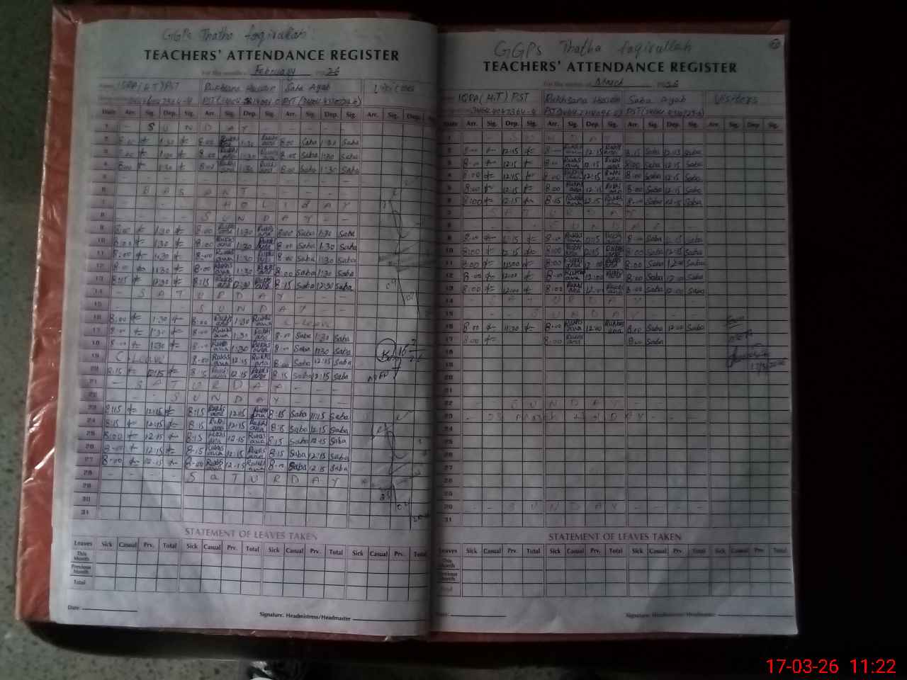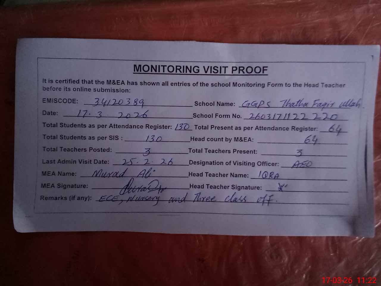| Attendance Register | Head Teacher | MEA with School | Visit Proof |