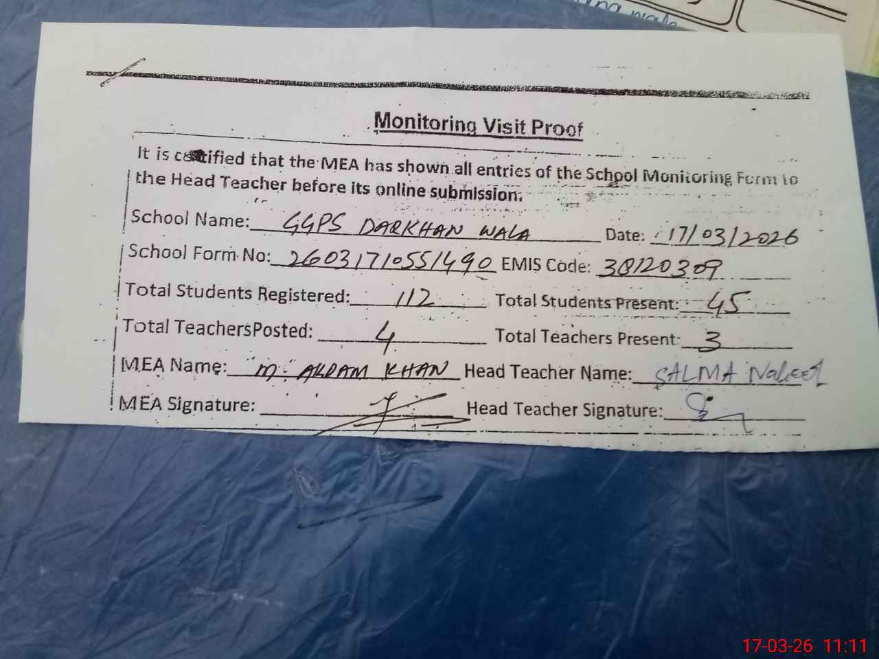 | Attendance Register | Head Teacher | MEA with School | Visit Proof |