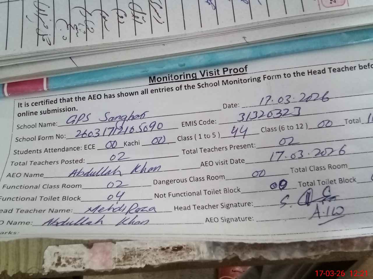 | EMIS Code: 31320323 | Name of School: GPS SANGHAR | |||