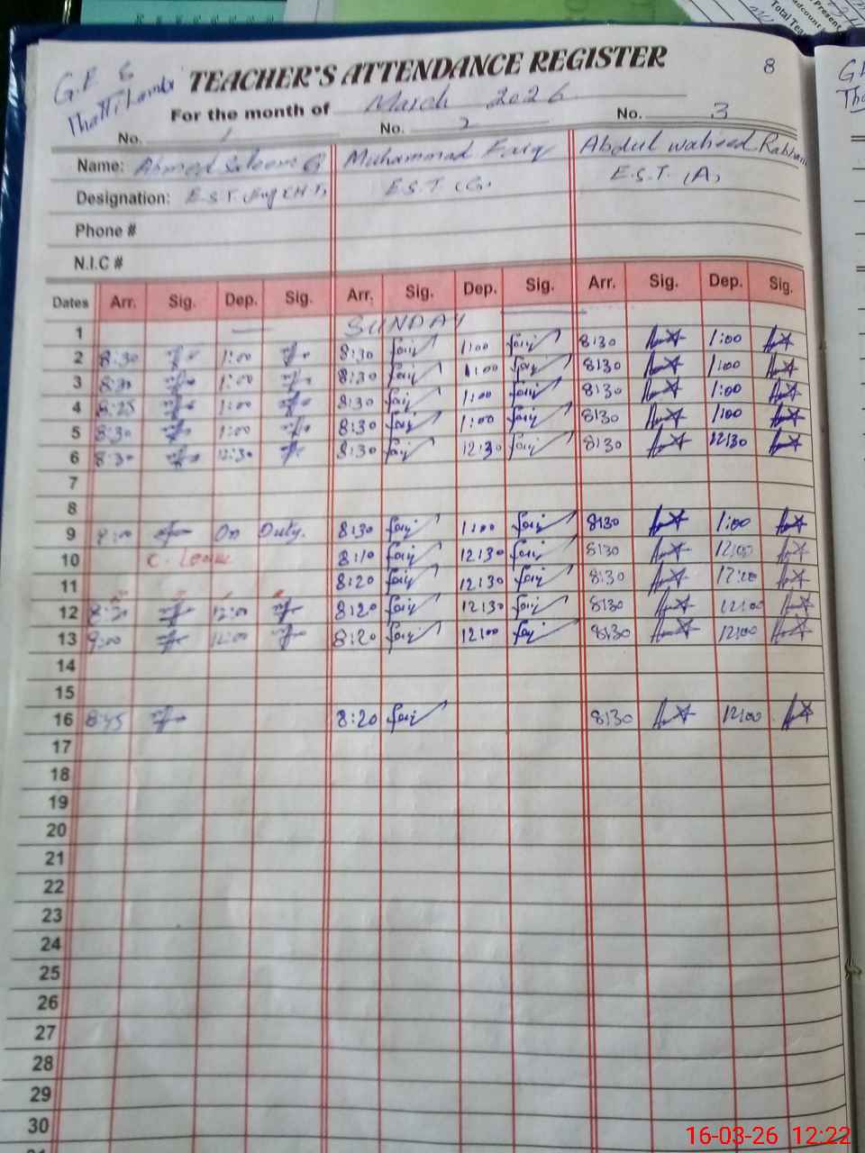| CNIC | Full Name | Designation | R/C | Absence during last cal. month |