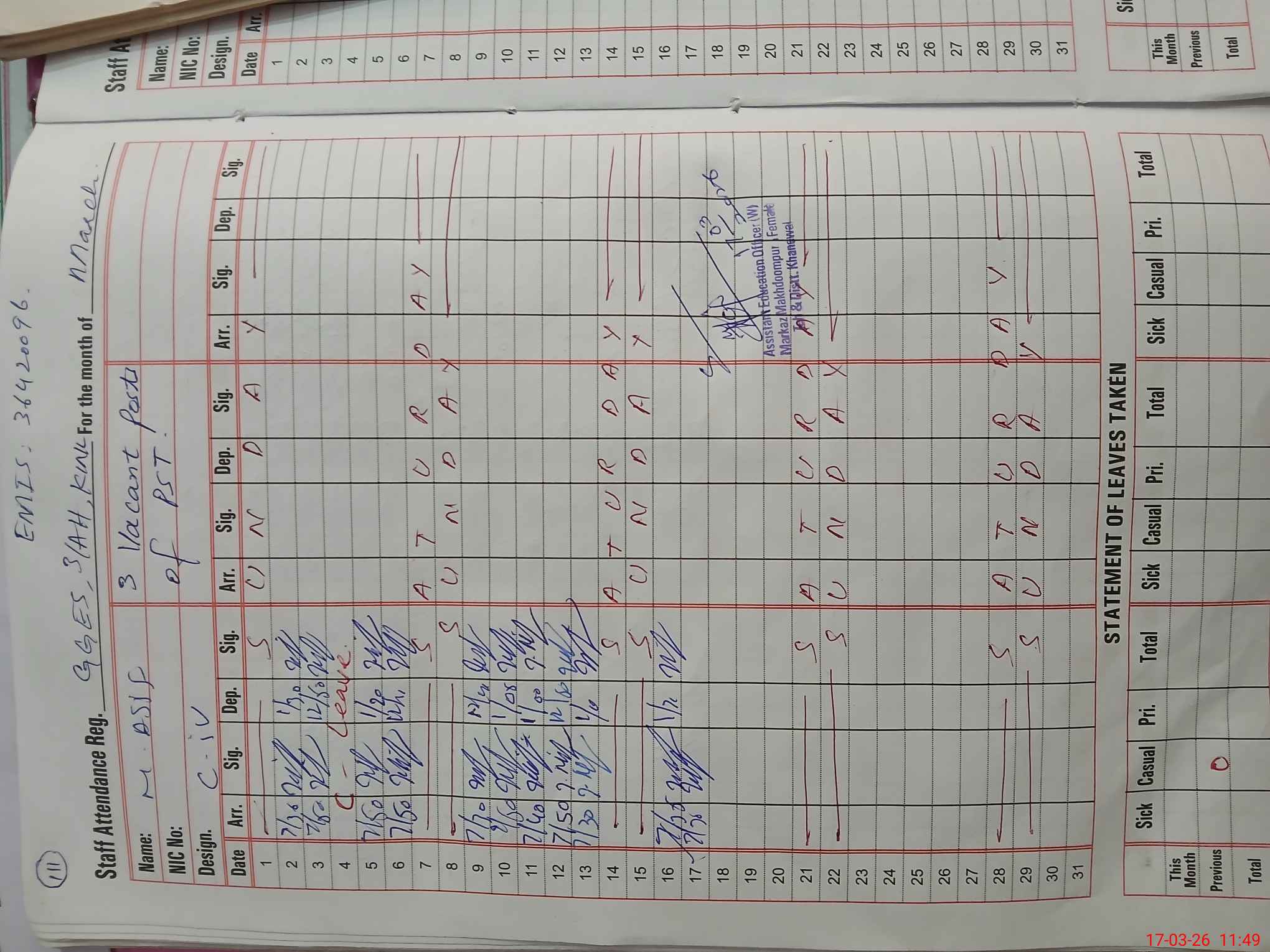 | CNIC | Full Name | Designation | R/C | Absence During Last Calender Month |