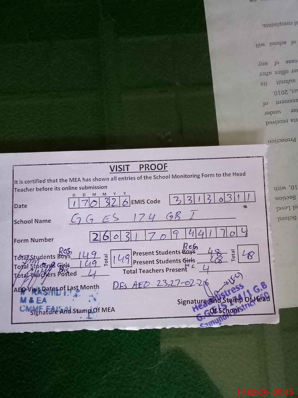 | Attendance Register | Head Teacher | MEA with School | Visit Proof |
