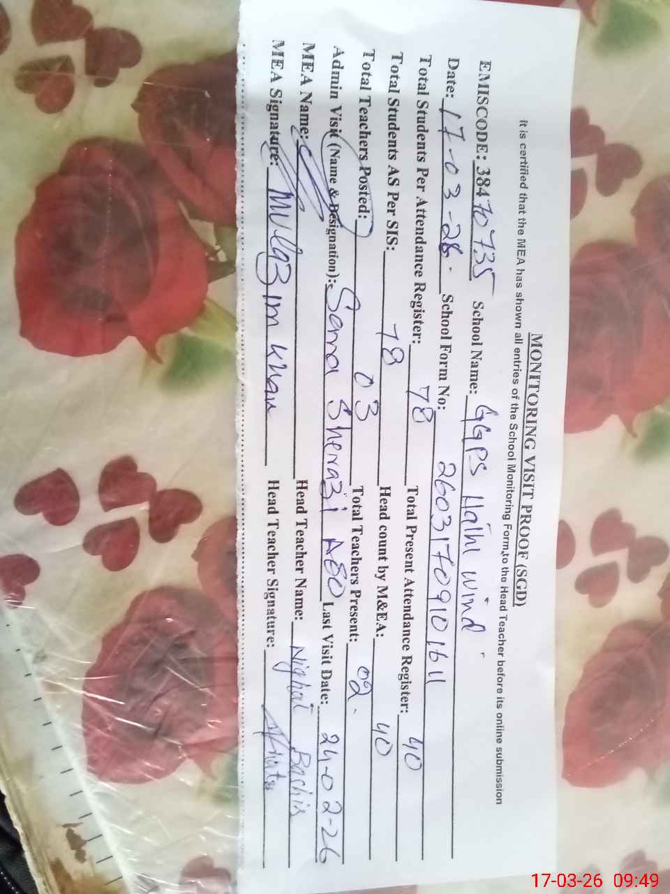 | Attendance Register | Head Teacher | MEA with School | Visit Proof |