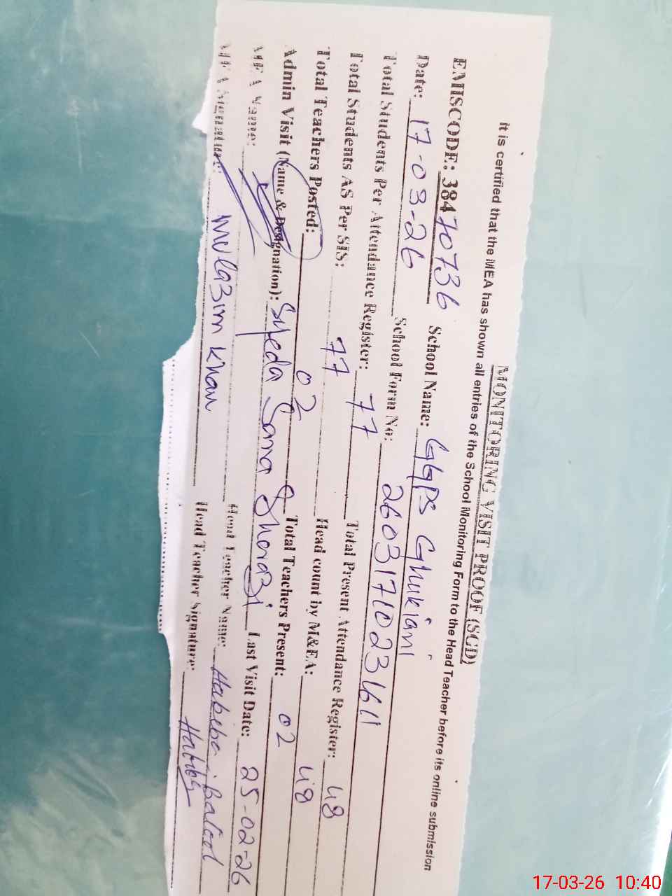 | Attendance Register | Head Teacher | MEA with School | Visit Proof |