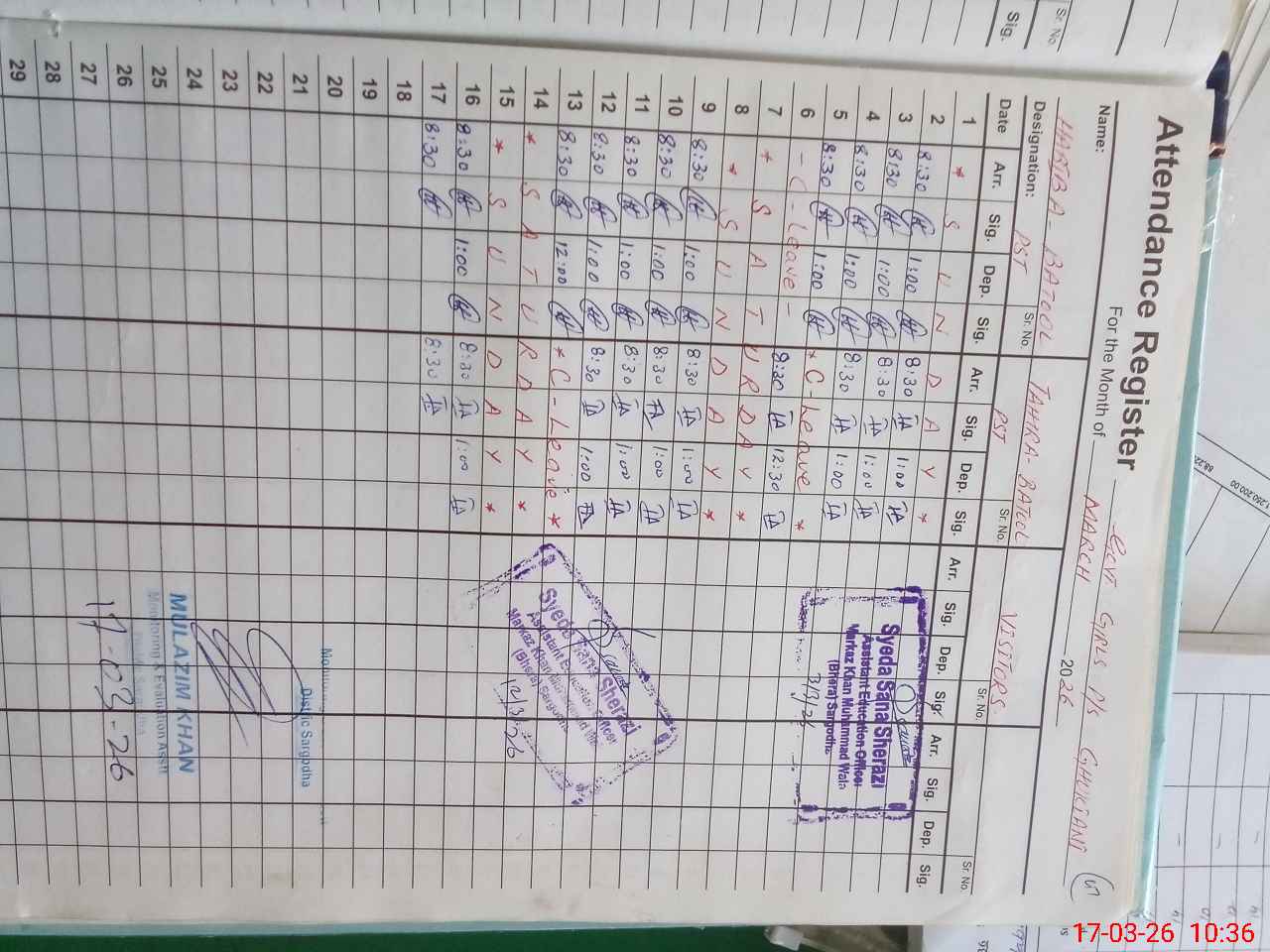 | CNIC | Full Name | Designation | R/C | Absence During Last Calender Month |