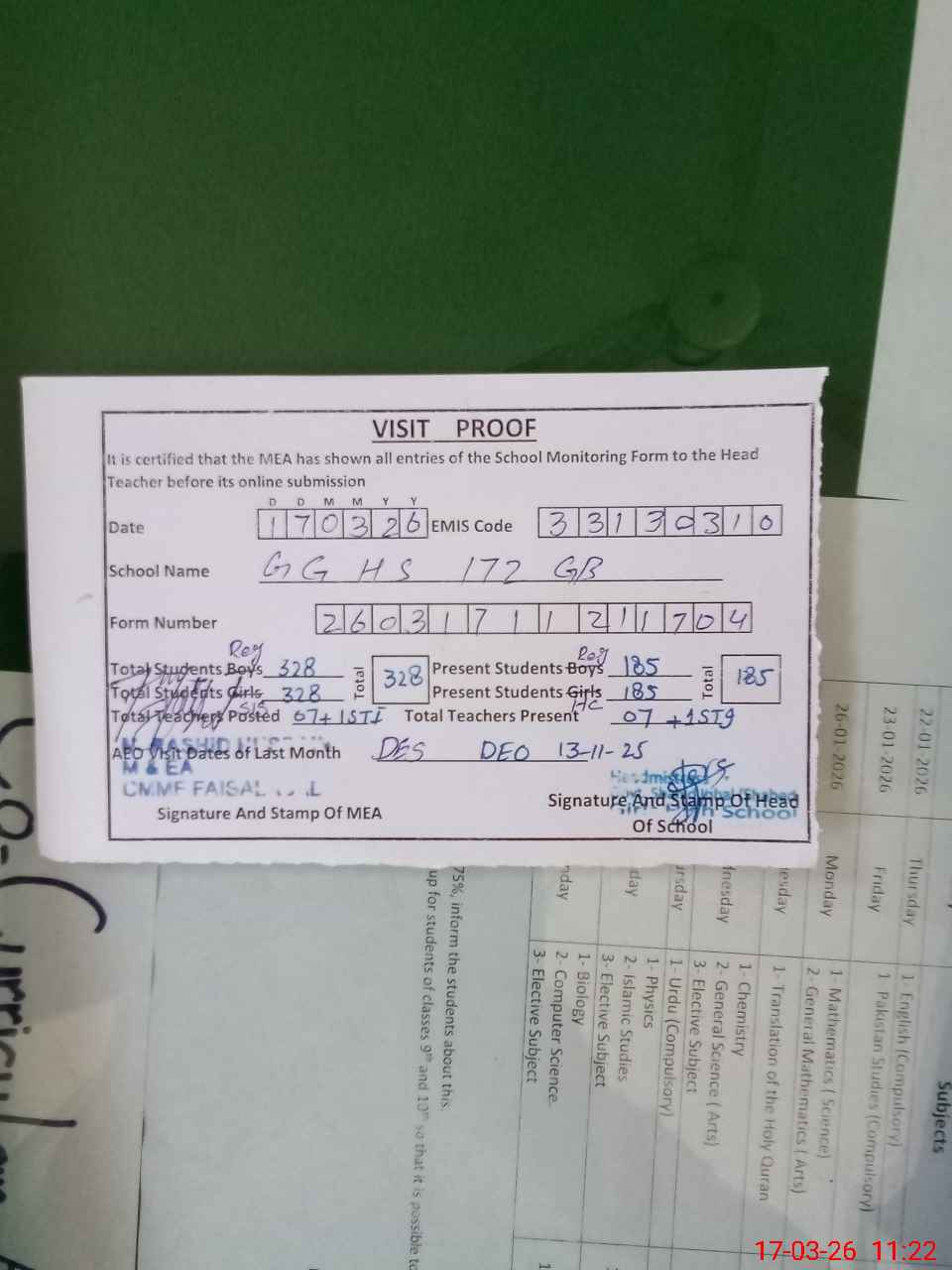 | Attendance Register | Head Teacher | MEA with School | Visit Proof |