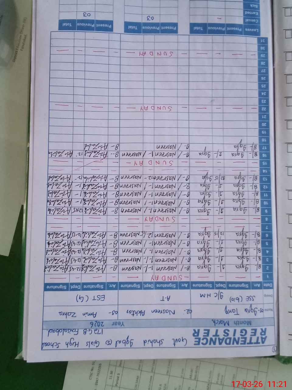 | Remarks (Use Separate Page if Required): class 3 have 19, class 9, 59 ,and class 10 have 58 students admitted in school but they are not present today due to there in no exams scheduled for these classes. | |||||