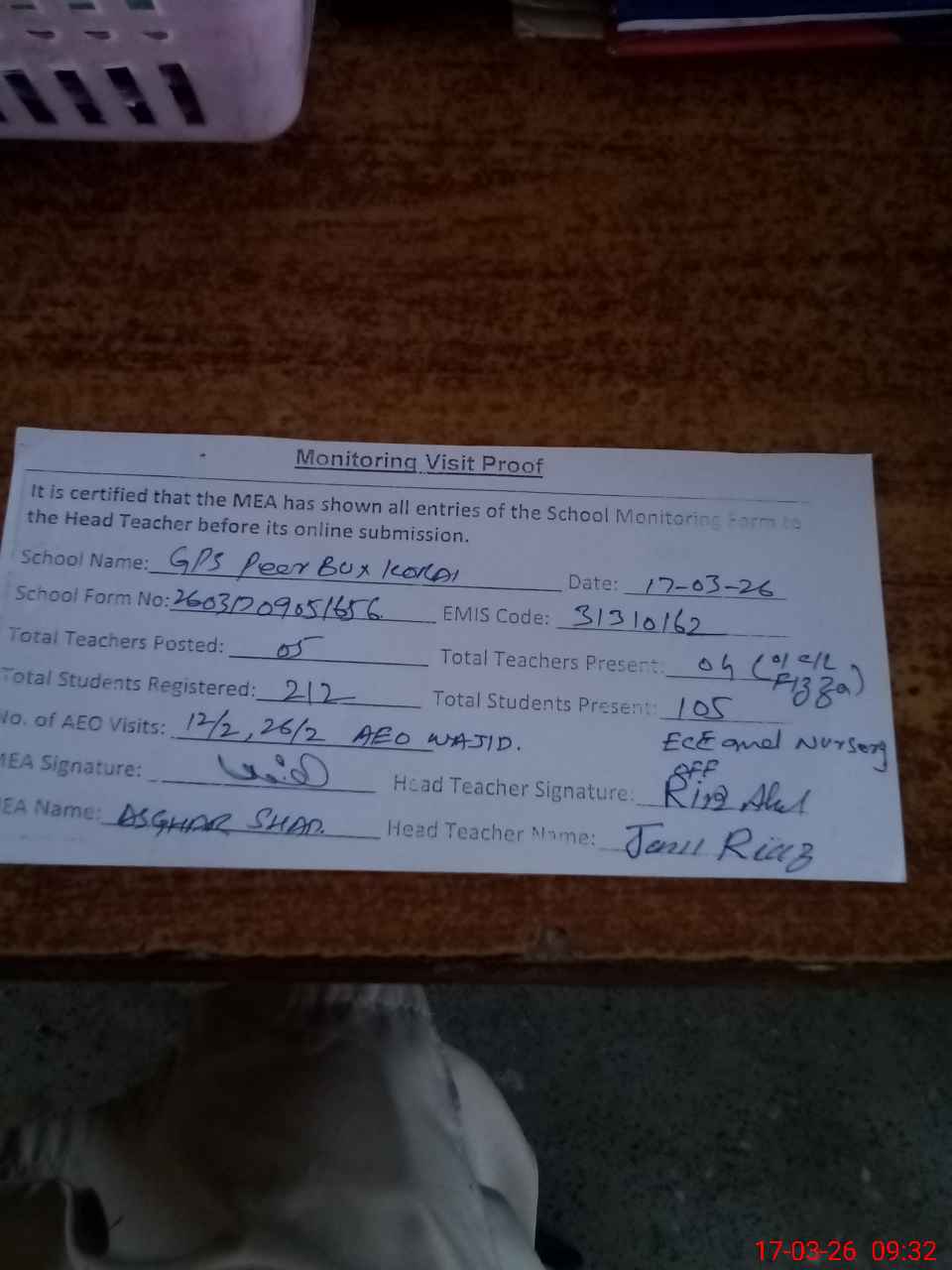 | Attendance Register | Head Teacher | MEA with School | Visit Proof |
