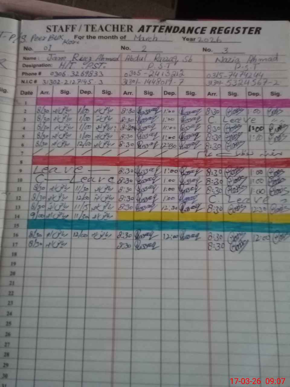 | CNIC | Full Name | Designation | R/C | Absence during last cal. month |