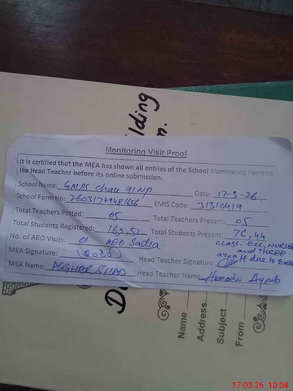 | Attendance Register | Head Teacher | MEA with School | Visit Proof |