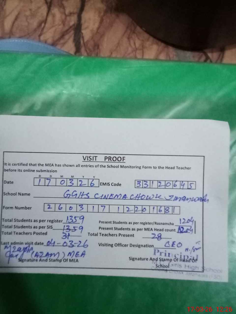 | EMIS Code: 33120645 | Name of School: GGHS MC CINEM CHOWK | |||