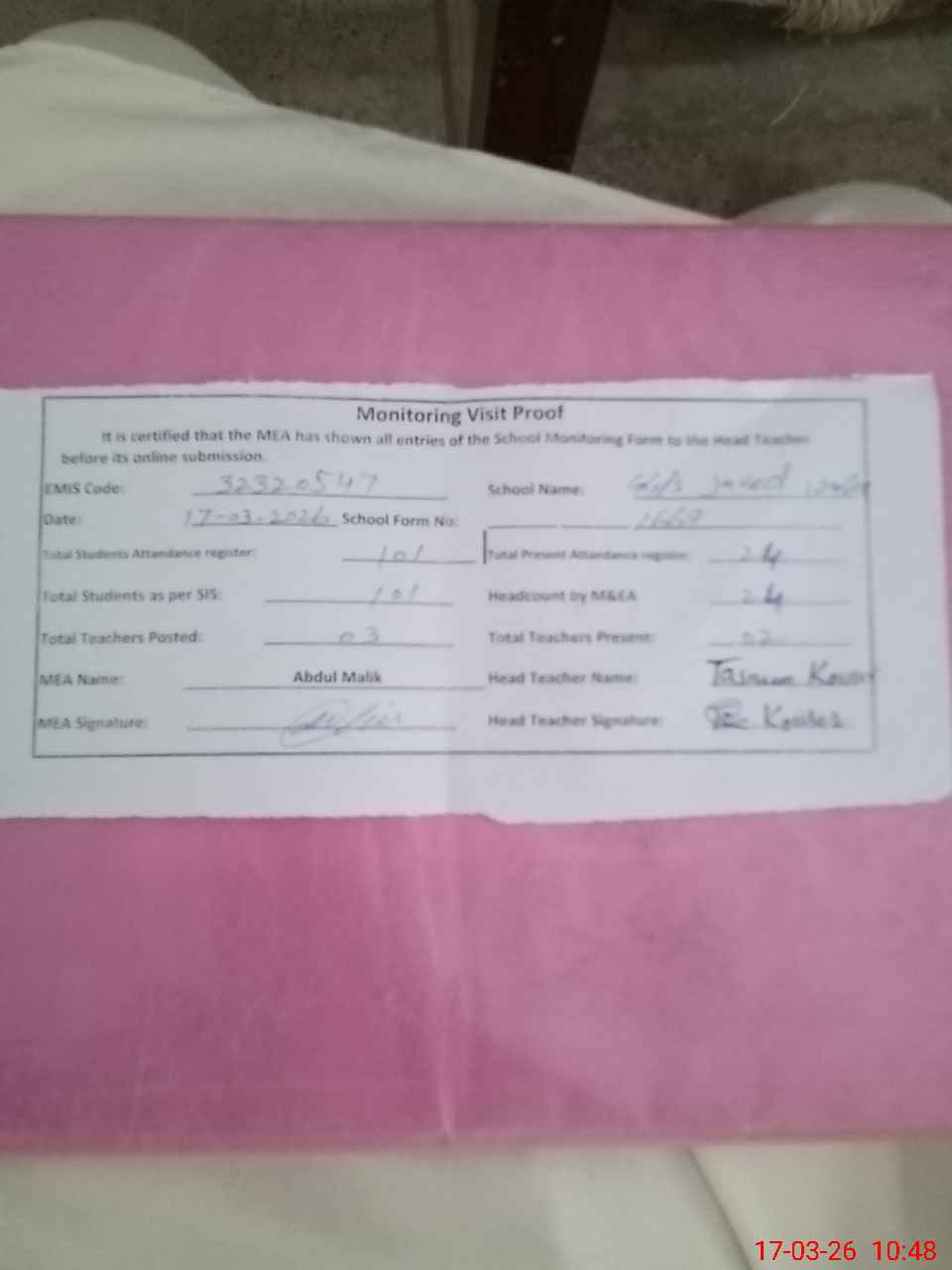 | EMIS Code: 32320547 | Name of School: GGPS JAVED WALA | |||