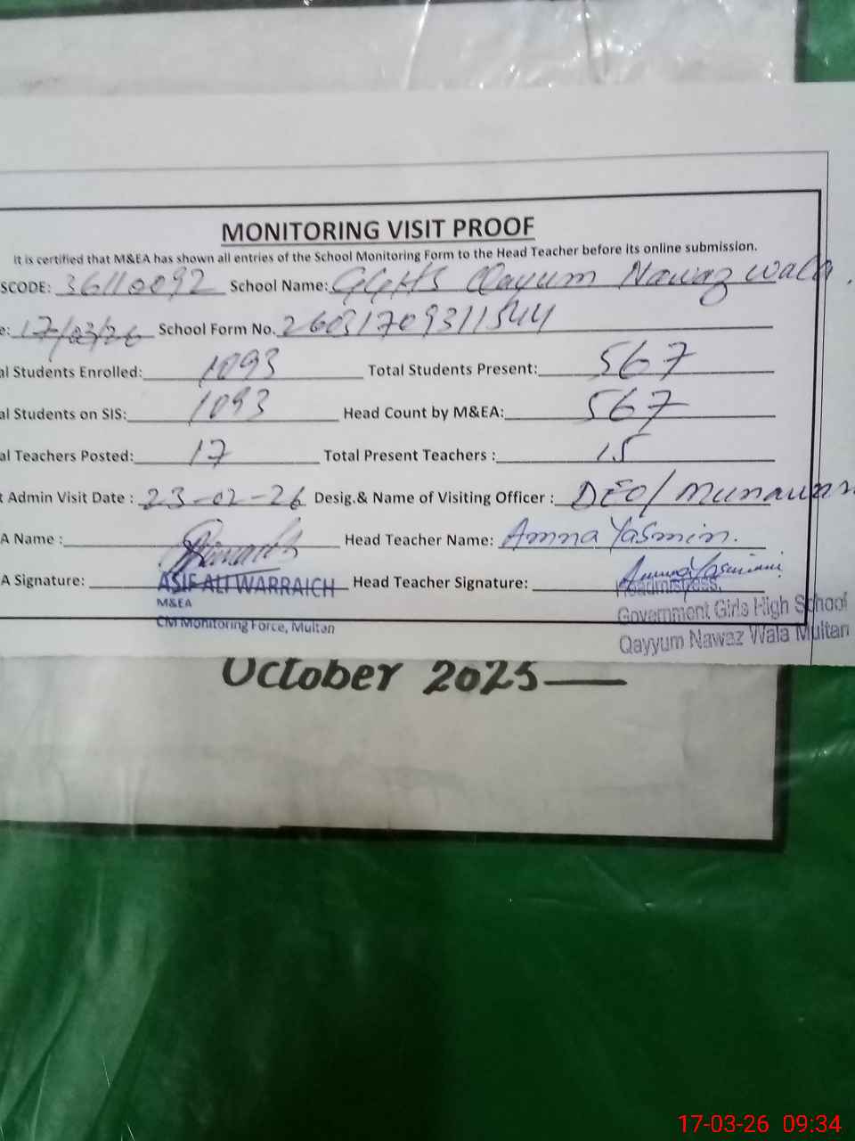 | EMIS Code: 36110092 | Name of School: GGHS QAYYUM NAWAZ WALA MULTAN | |||