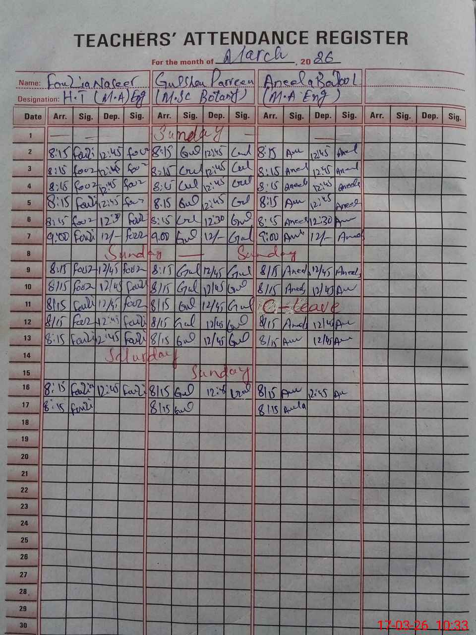 | CNIC | Full Name | Designation | R/C | Absence During Last Calender Month |