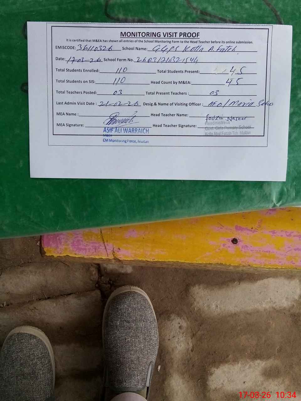 | Attendance Register | Head Teacher | MEA with School | Visit Proof |