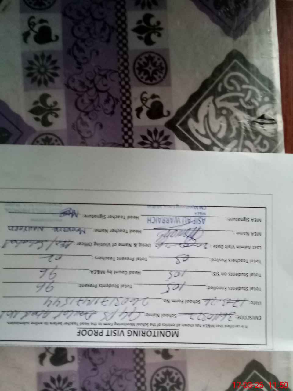 | Attendance Register | Head Teacher | MEA with School | Visit Proof |