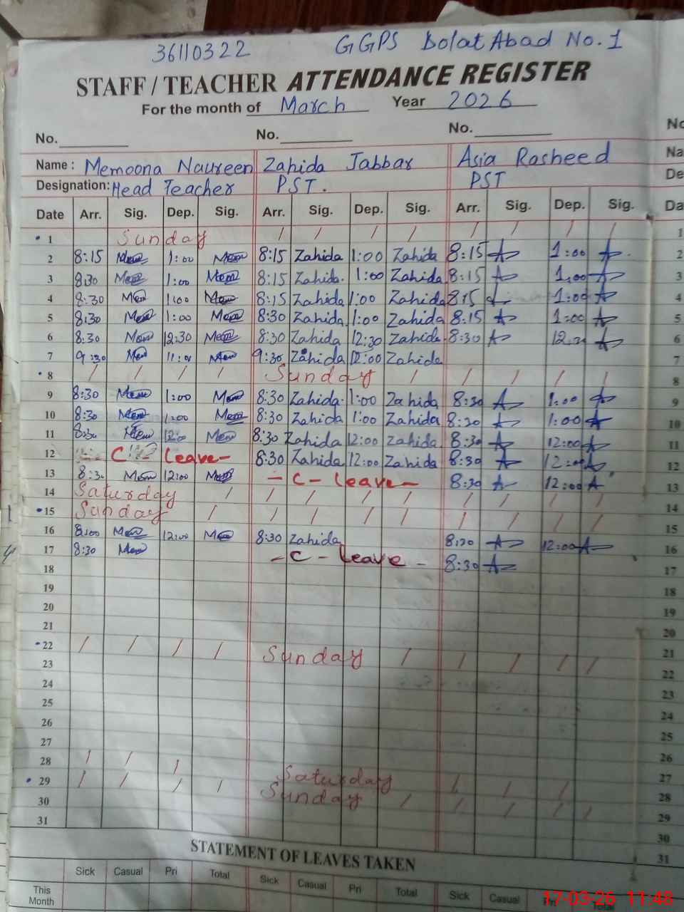 | 36**** | Ha**** Za**** Ja**** | PST Science/Maths | Regular | 0 | 0 | 0 | 0 | 0 | 0 | 0 | 0 | 0 | Casual |