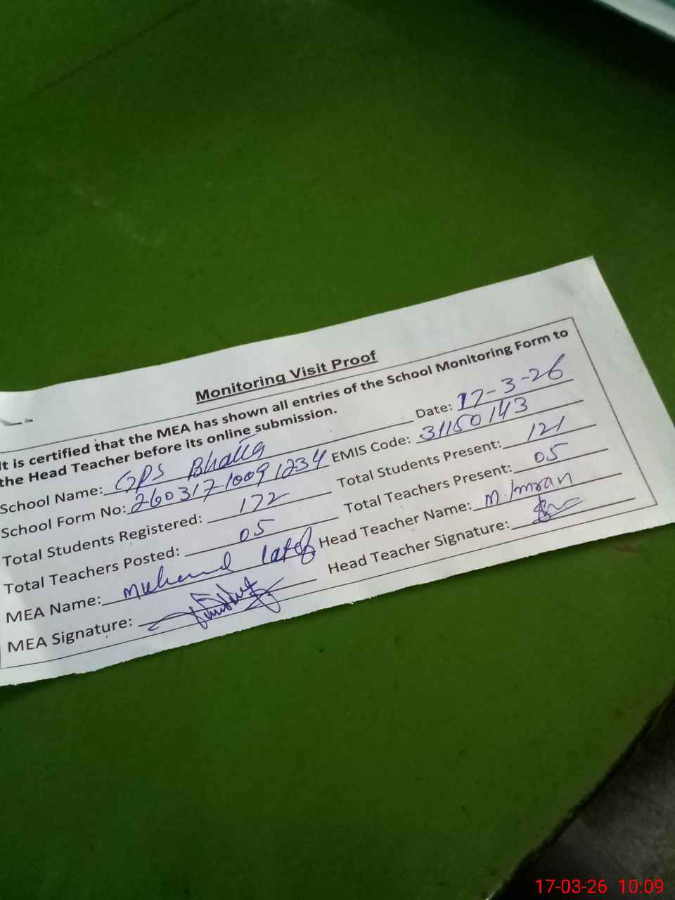| Attendance Register | Head Teacher | MEA with School | Visit Proof |