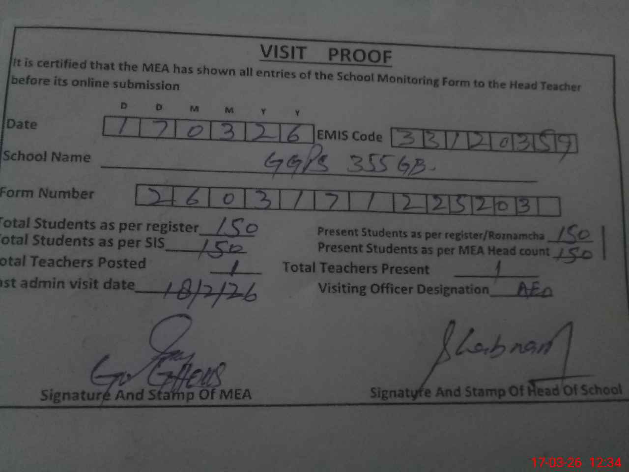 | Name: SH**** AM**** Designation: (School Headmaster's/Headmistress's) PST Phone/Cell Number: 03**** |