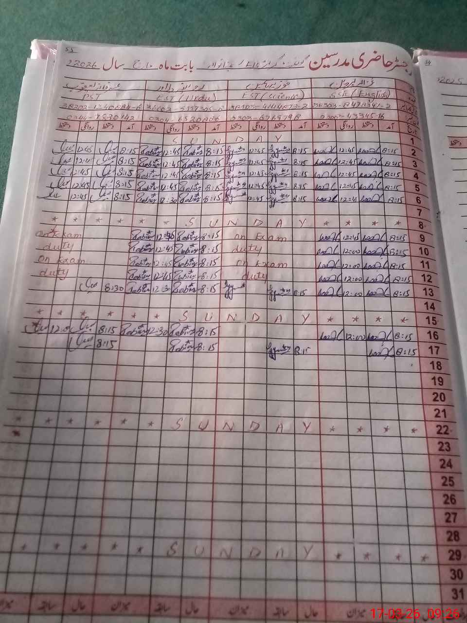 | CNIC | Full Name | Designation | R/C | Absence During Last Calender Month |