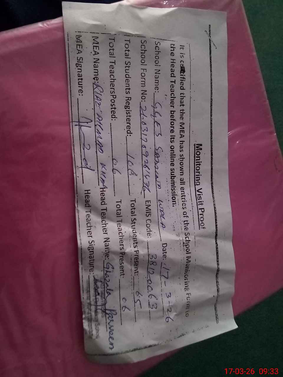 | Attendance Register | Head Teacher | MEA with School | Visit Proof |