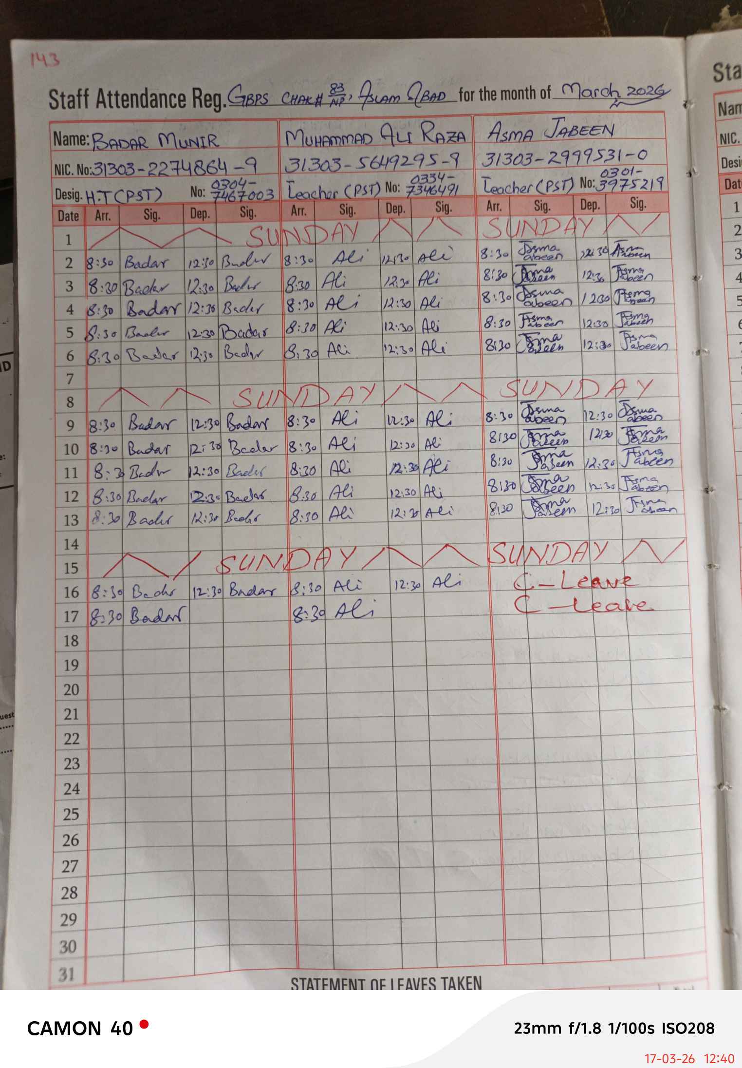 | CNIC | Full Name | Designation | R/C | Absence during last cal. month |