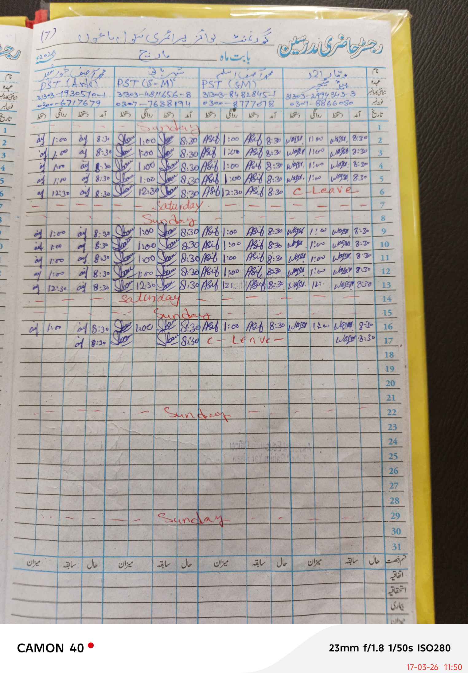 | CNIC | Full Name | Designation | R/C | Absence During Last Calender Month |