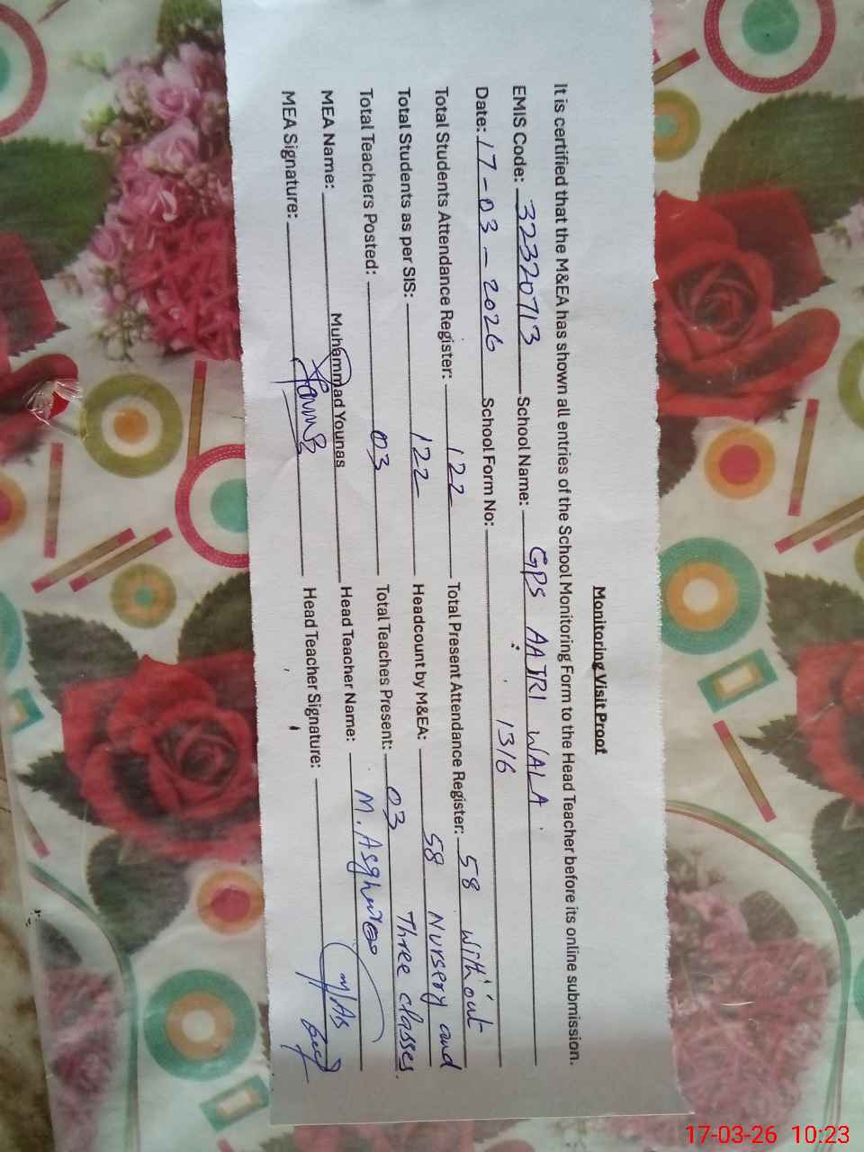 | EMIS Code: 32320713 | Name of School: GPS AAJRY WALA | |||