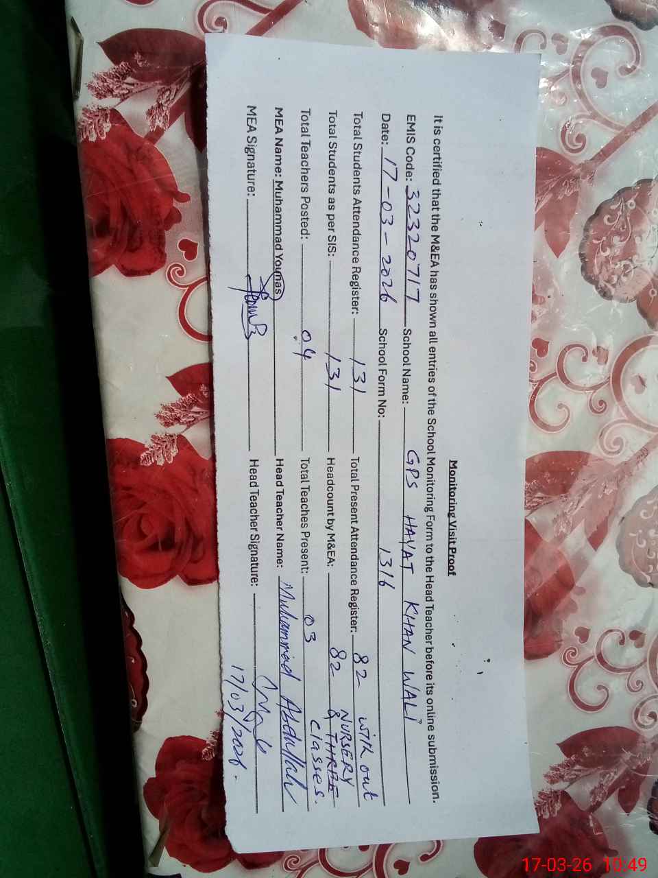 | EMIS Code: 32320717 | Name of School: GPS HAYAT KHAN WALI | |||