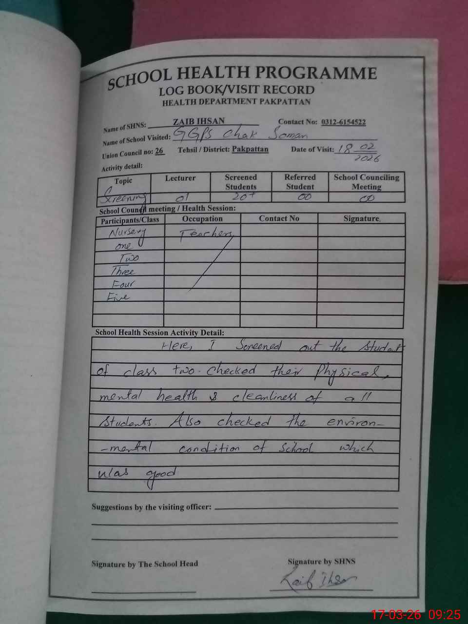| School Visited by School Health & Nutrition Supervisor (No. of Visits) | 1 | Name1: | Zaib Ihsan | Name2: | Nil |
