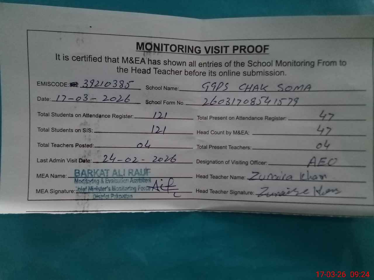 | Attendance Register | Head Teacher | MEA with School | Visit Proof |