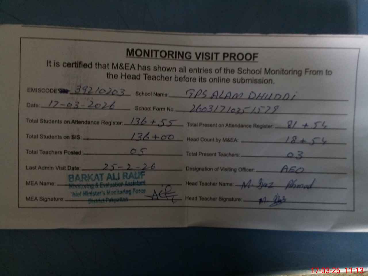| Attendance Register | Head Teacher | MEA with School | Visit Proof |