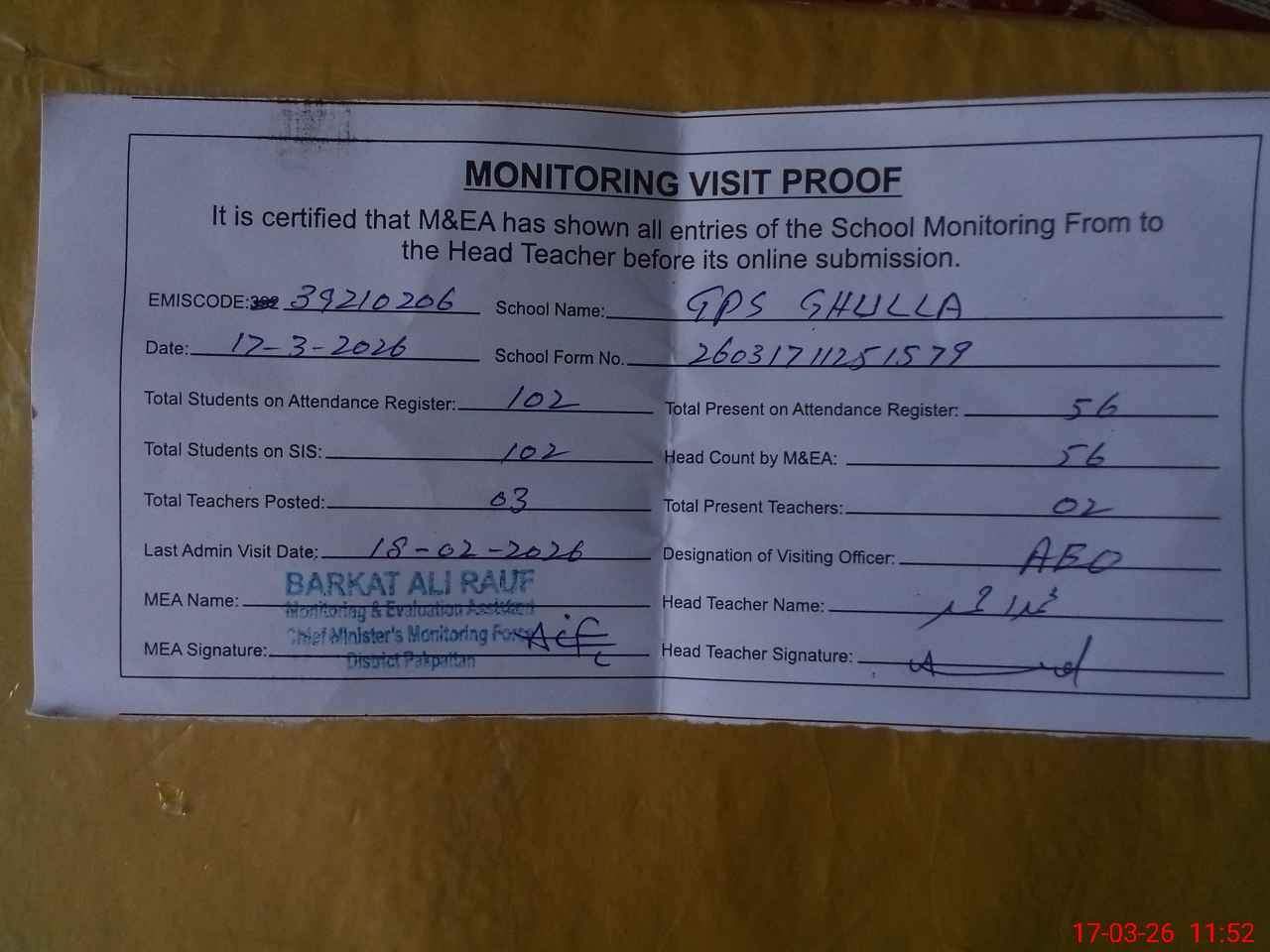 | Attendance Register | Head Teacher | MEA with School | Visit Proof |