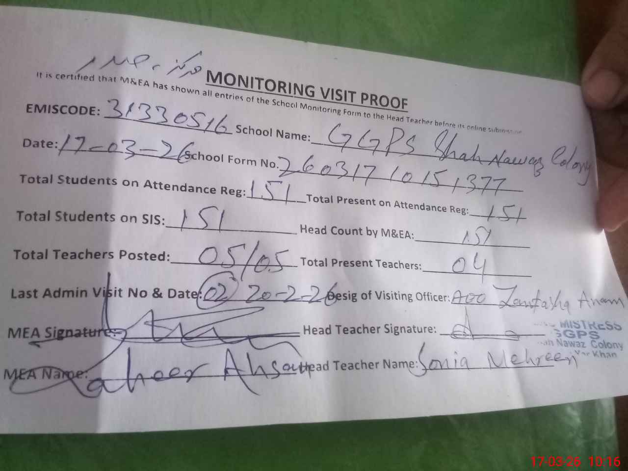 | Monitoring Date: 17-03-2026 | Start Time: 17-03-2026 09:48 AM | End Time: 17-03-2026 10:22 AM | Name of MEA: Za**** Ah**** | |