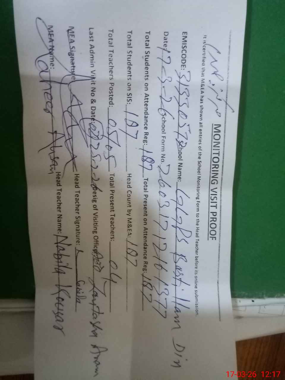 | Attendance Register | Head Teacher | MEA with School | Visit Proof |