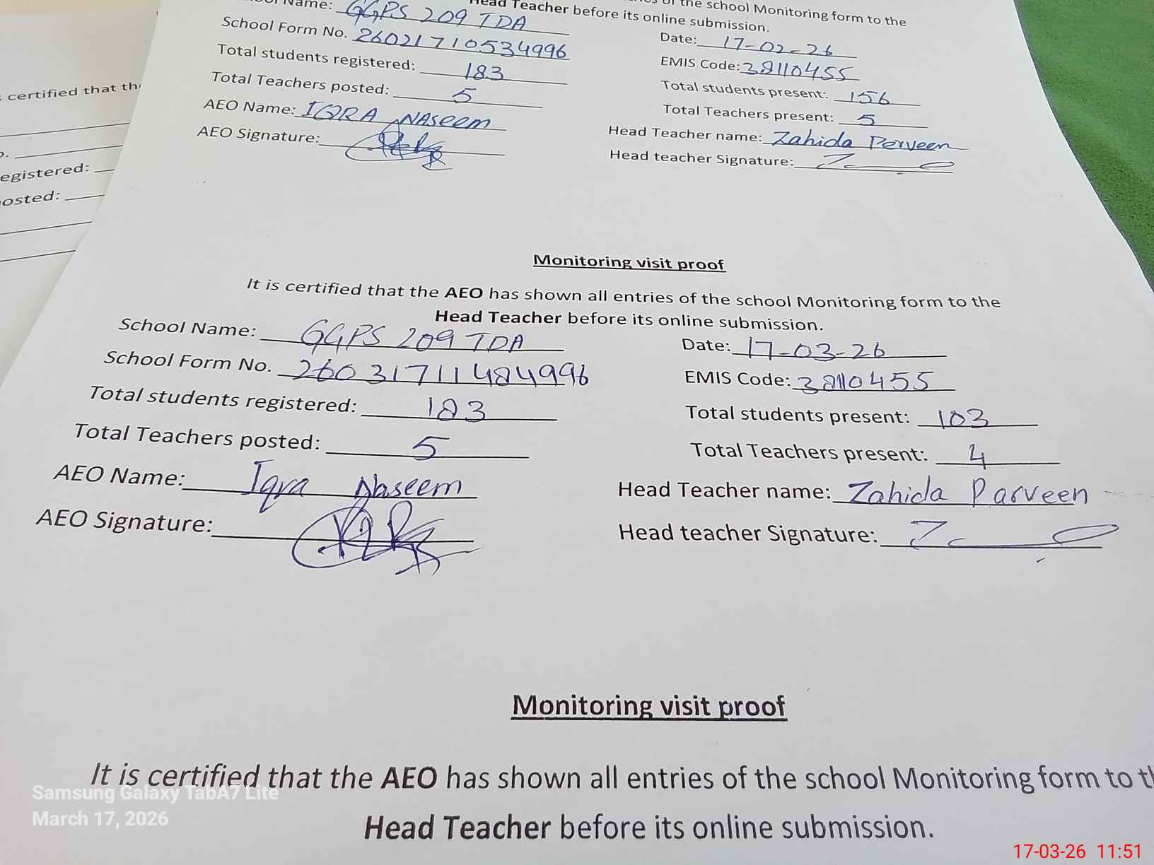 | Attendance Register | Head Teacher | MEA with School | Visit Proof |