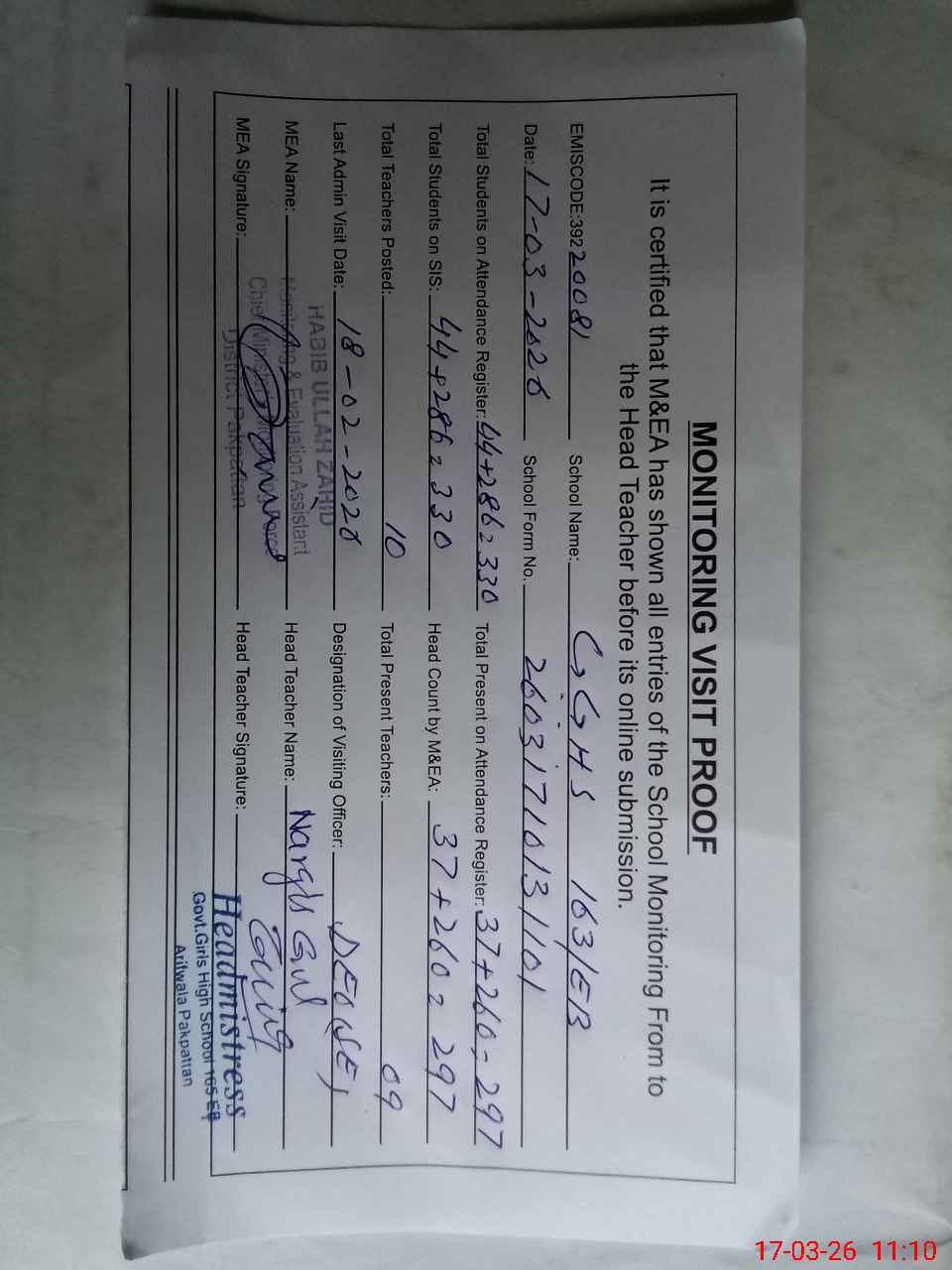 | Attendance Register | Head Teacher | MEA with School | Visit Proof |