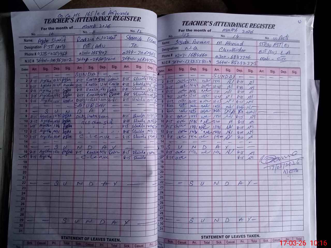 | Remarks (Use Separate Page if Required): NOTE. 1 STI MEHRUN NISA SST CNIC 3640138705362 , 2 STI ASIA ISHTIAQ SST (GEN) CNIC 3640107428002 3 STI NISH E MAN SST (GEN) 3640132960576 ALL ABOVE ARE FOUND PRESENT 4 STI RIFFAT HAMEED SST I T CNIC 3660127301460 ,she is on on c leave. | |||||