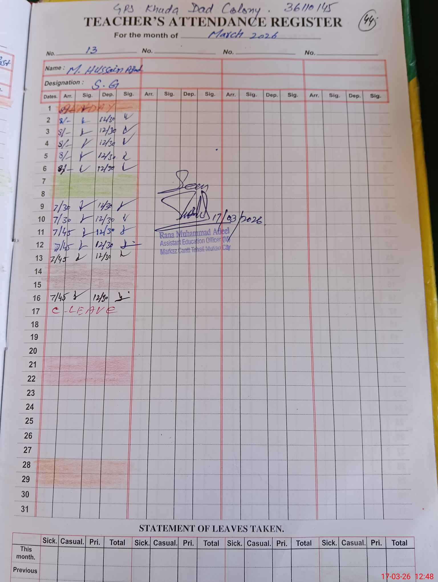 | EMIS Code: 36110145 | Name of School: GPS KHUDA DAD COLONY | |||