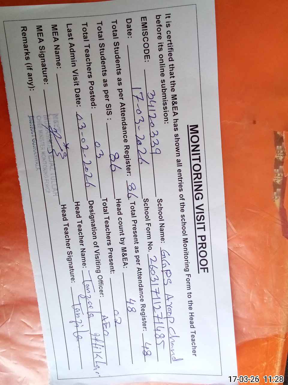 | Attendance Register | Head Teacher | MEA with School | Visit Proof |