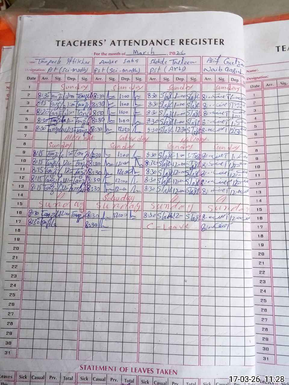 | Leave | Duty | Absent | Maternity | Medical | Ex- Pak |