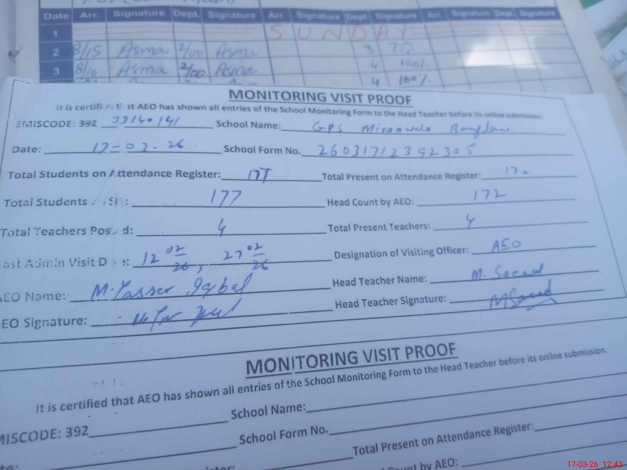 | Attendance Register | Head Teacher | MEA with School | Visit Proof |