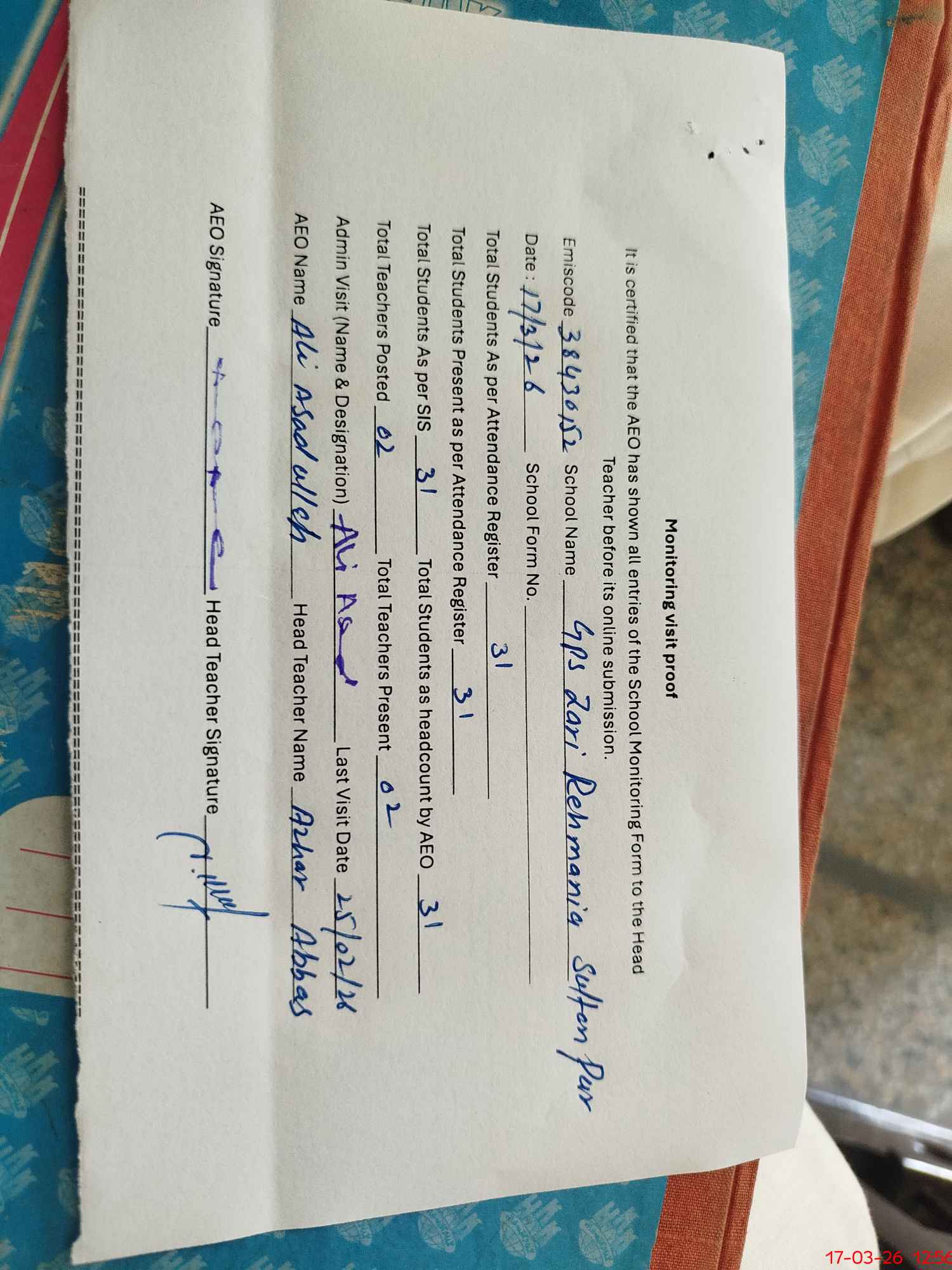 | Attendance Register | Head Teacher | MEA with School | Visit Proof |
