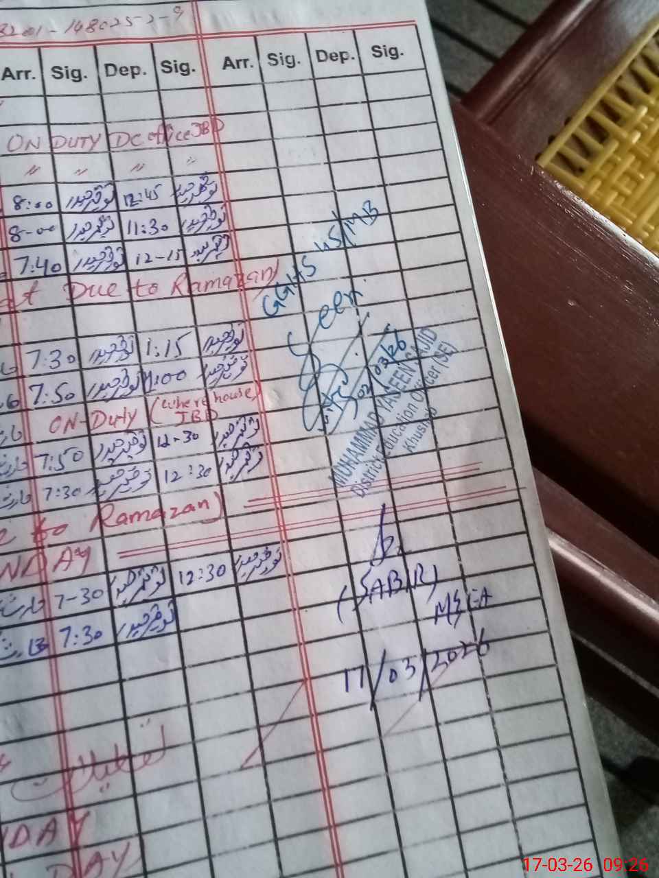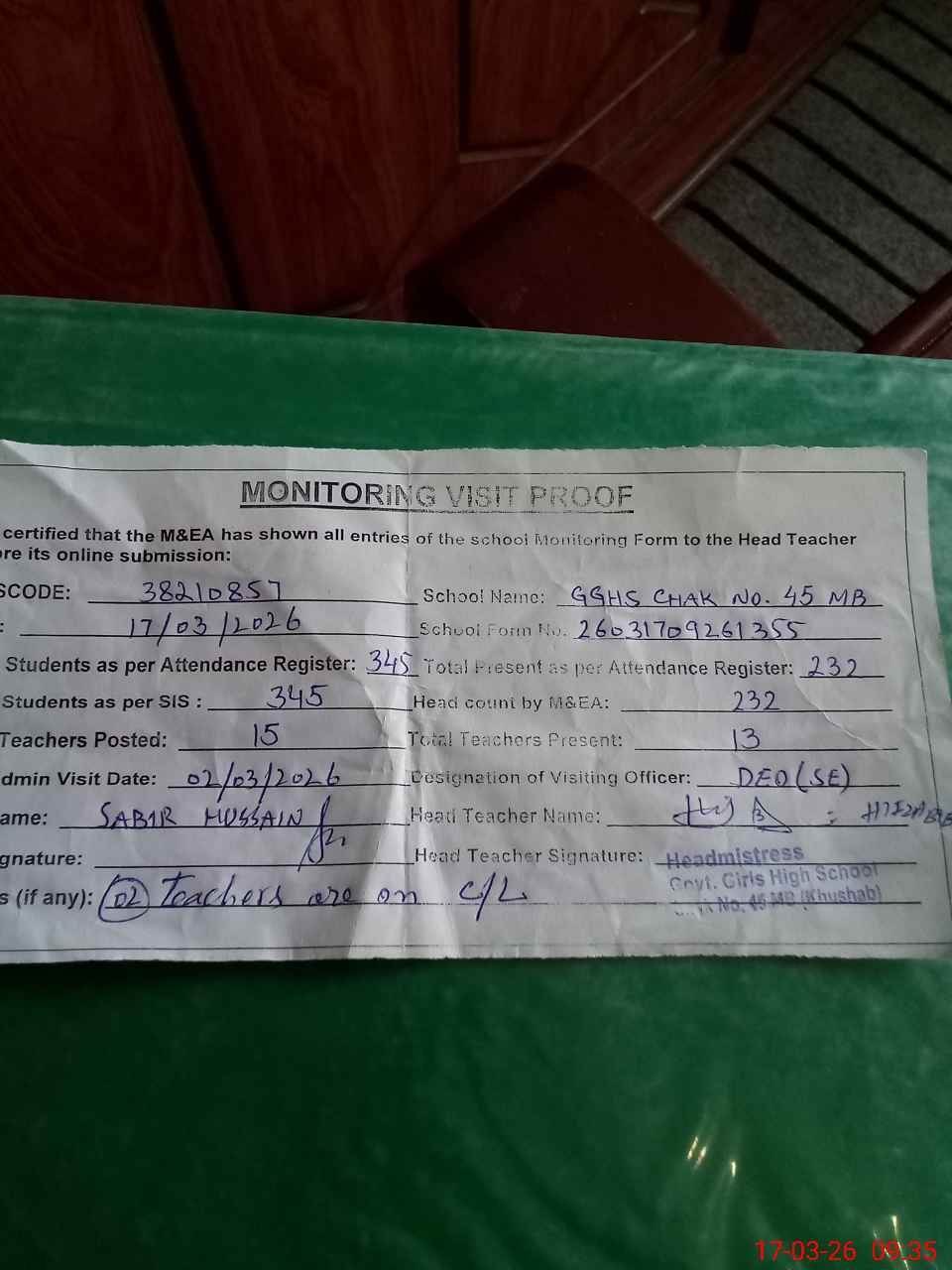 | Remarks (Use Separate Page if Required): no teacher absent total students on register 345 total students on SiS 345 last admin visit by AEO on 02 Mar 2026 | |||||
